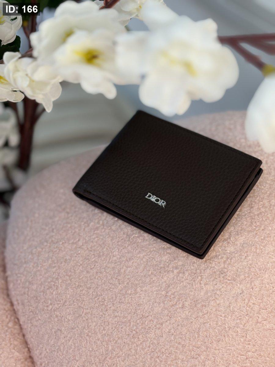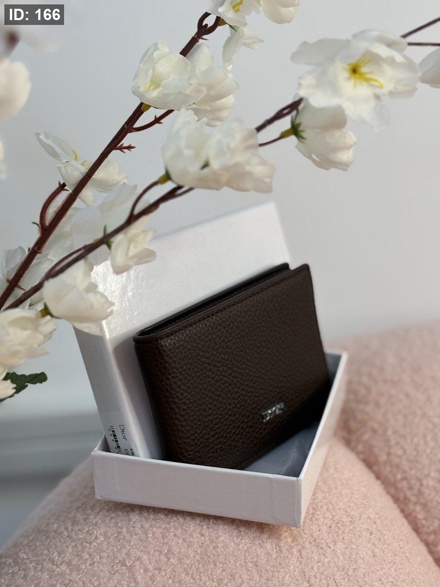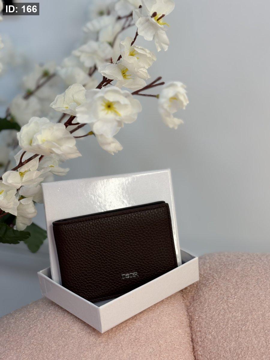تأتي المحفظة في علبة بيضاء أنيقة، مما يوحي بأنها قد تكون هدية أو منتجًا فاخرًا. تتميز بتصميم كلاسيكي وبسيط، مع نسيج محبب على الجلد.