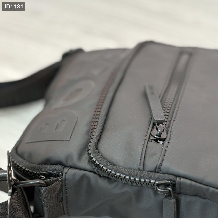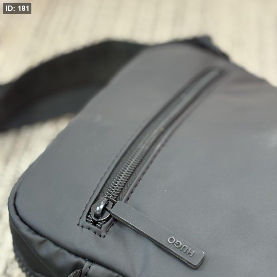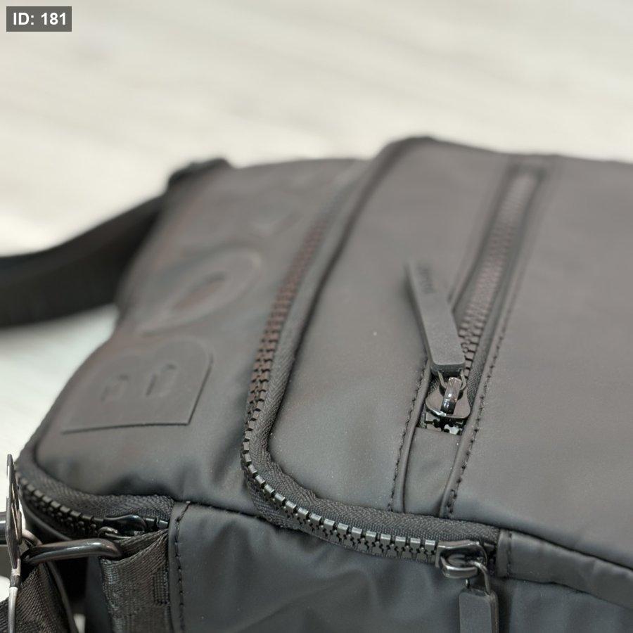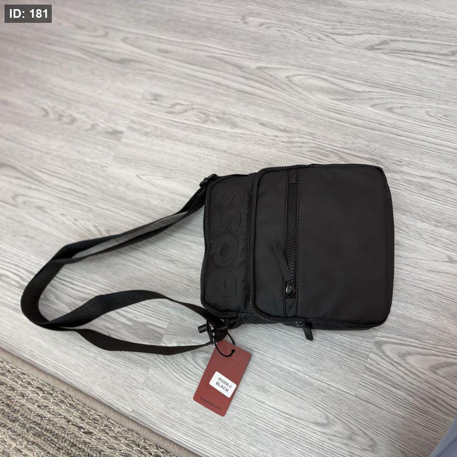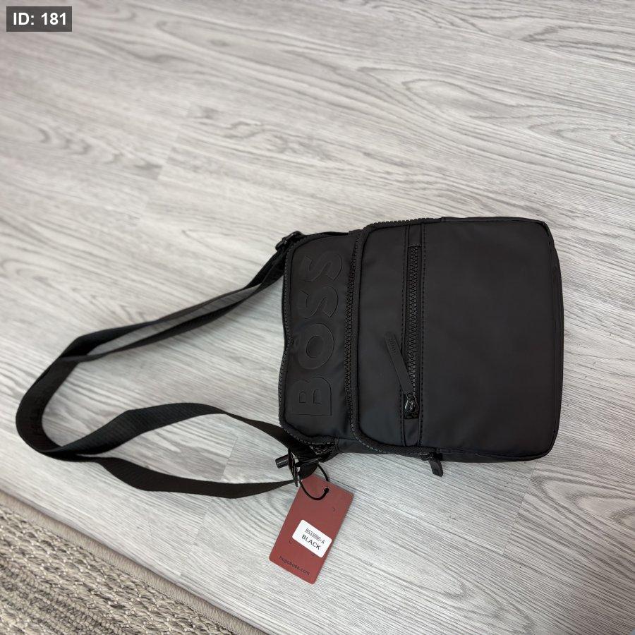 - الحقيبة المعروضة في الصورة هي حقيبة كتف سوداء اللون تحمل شعار "BOSS" البارز على جانبها الأيسر. تتميز الحقيبة بسحاب أمامي عمودي وجيب آخر بسحاب في الجزء السفلي، وتظهر تفاصيل الخياطة حول الحواف.