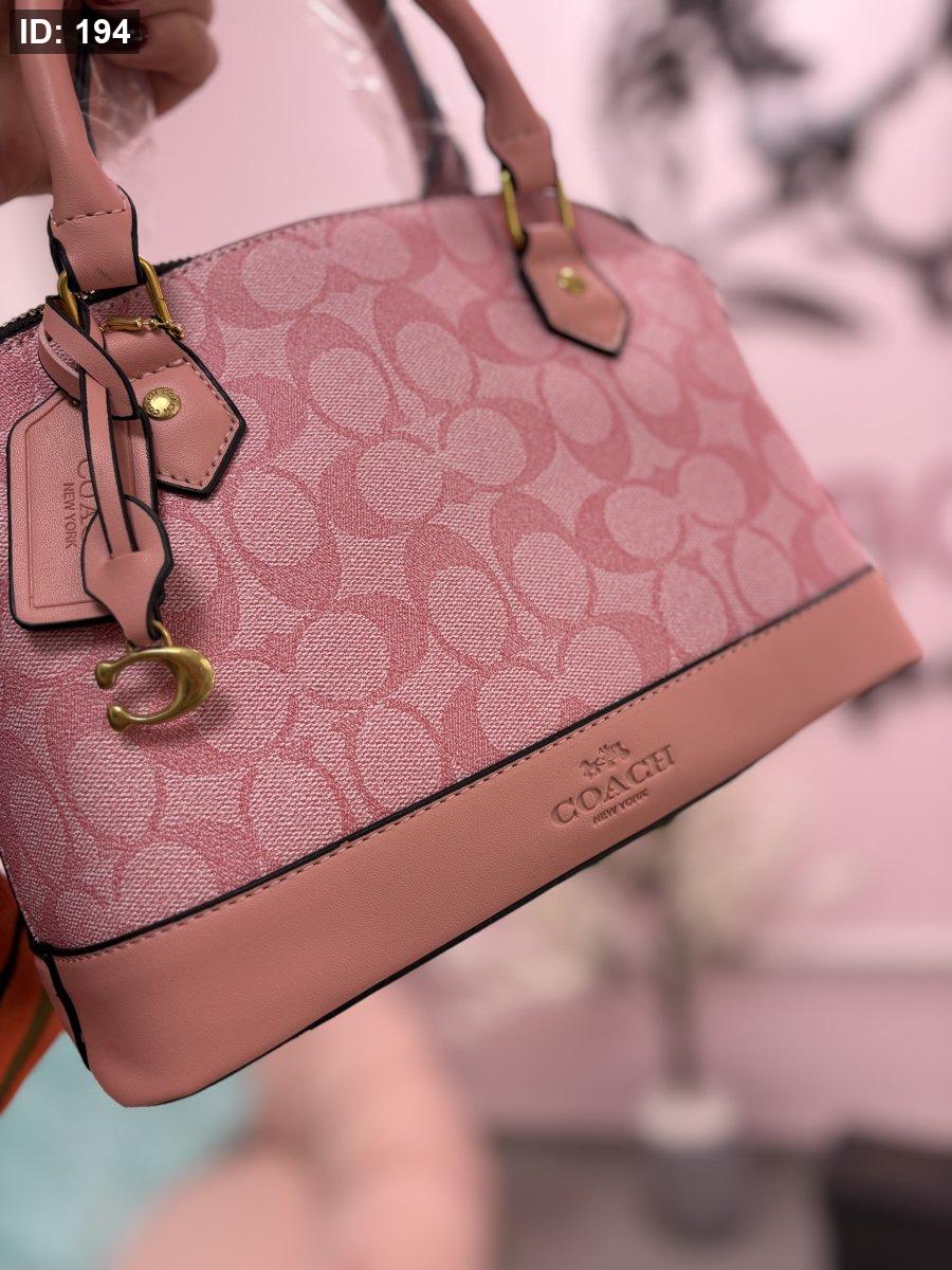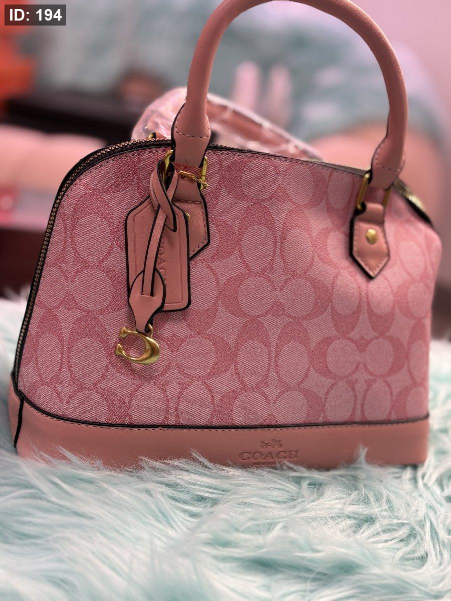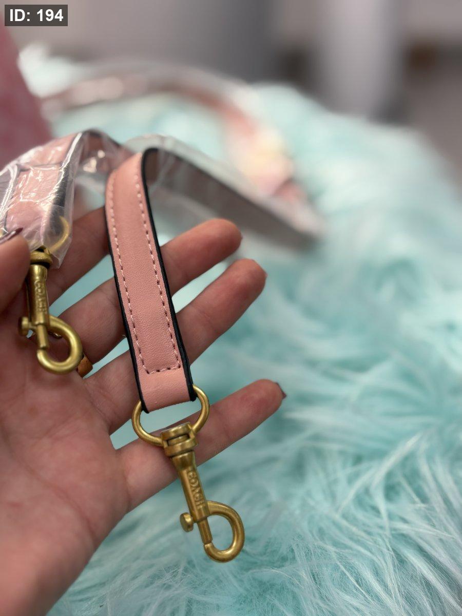 اللون: وردي مع نقشة شعار الماركة باللون الوردي الفاتح، وحواف جلدية باللون الوردي الداكن