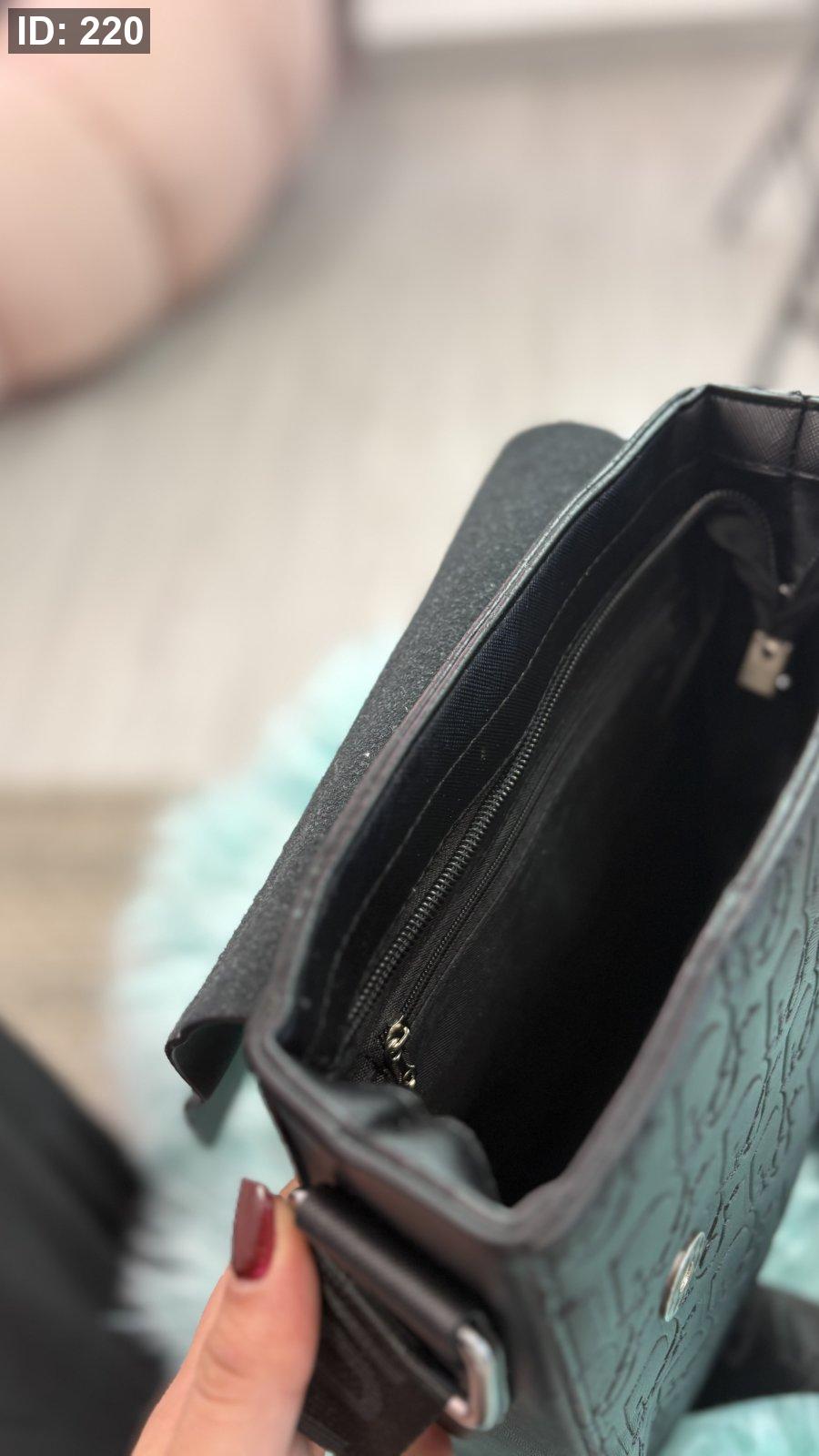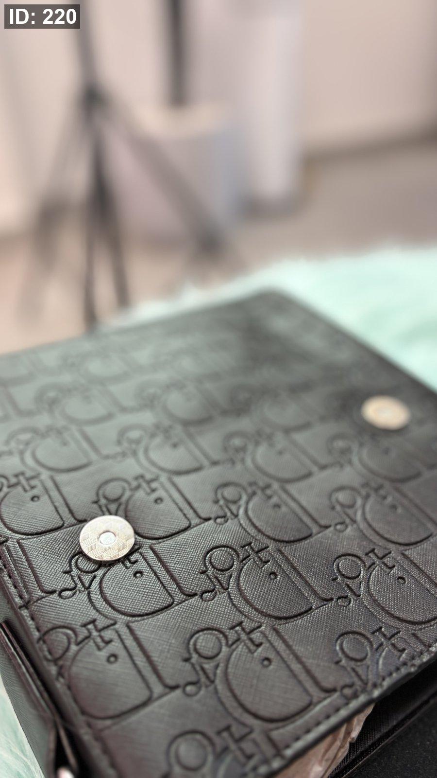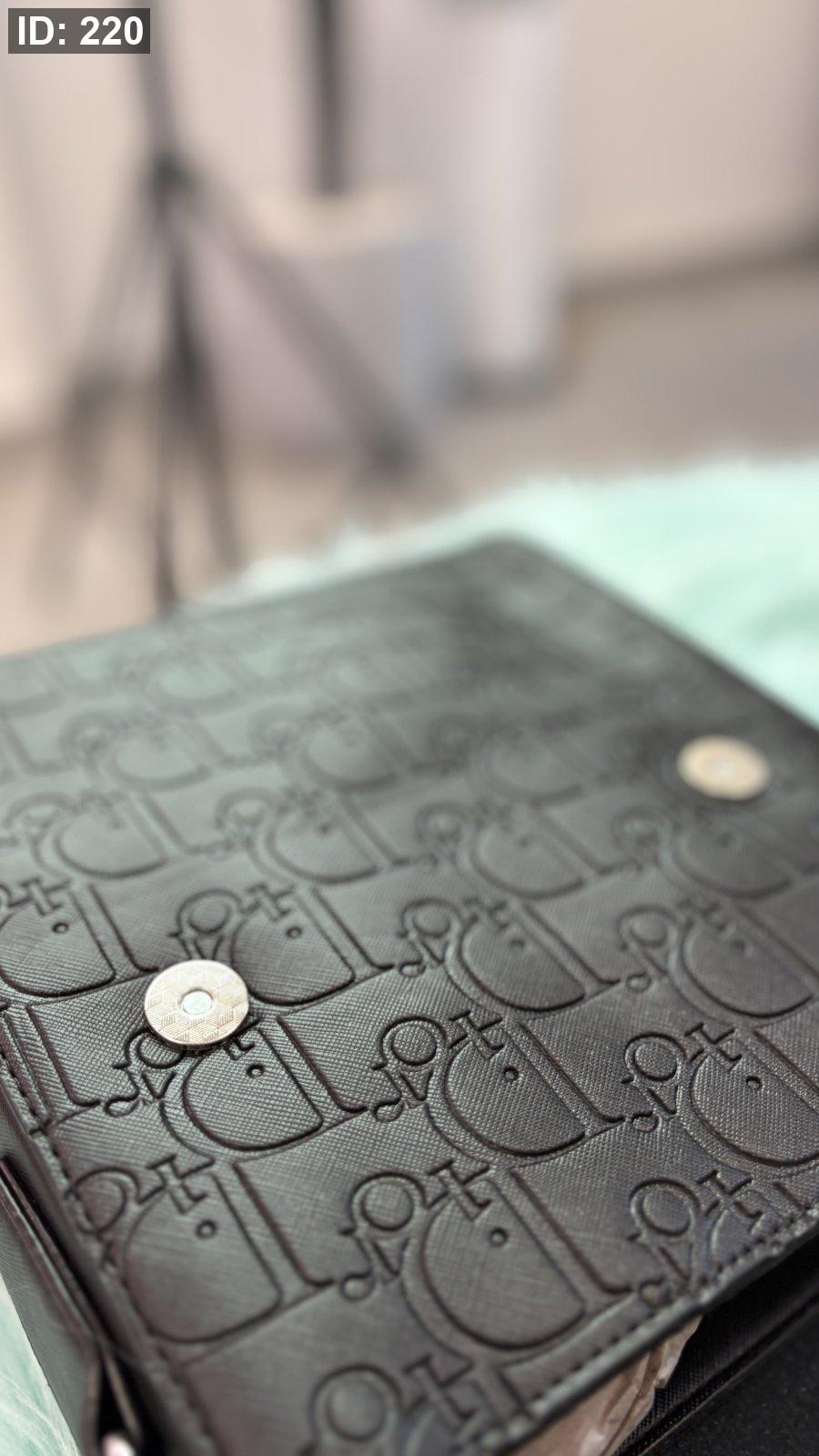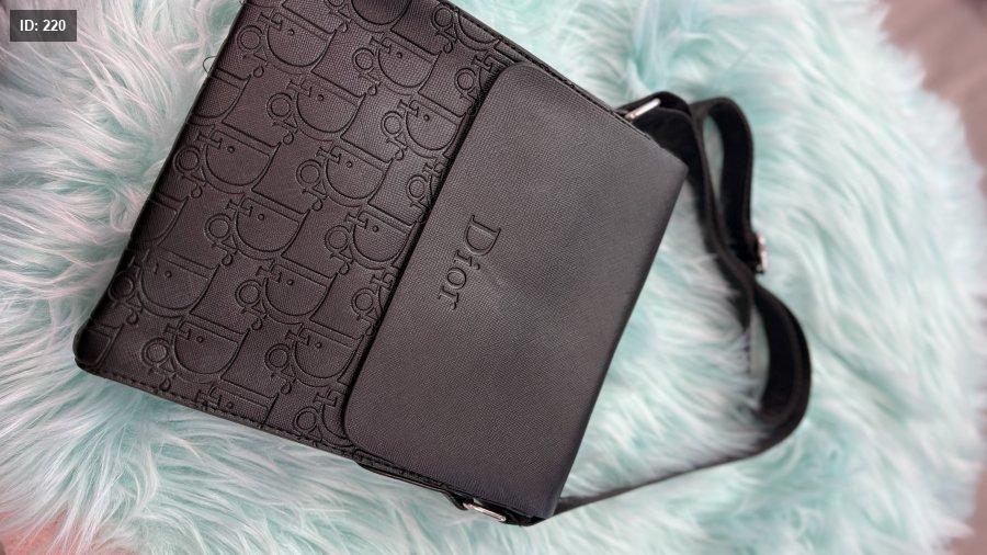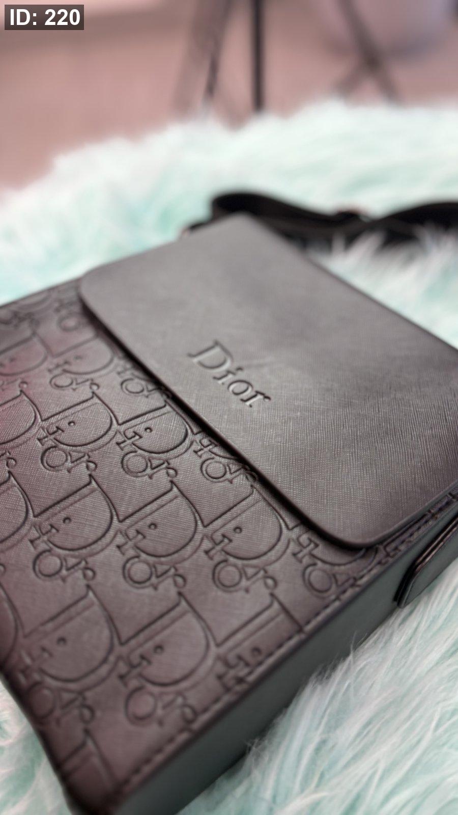 تتميز الحقيبة بتصميم فريد يجمع بين نقشة شعار "Dior" المتكررة على الجسم الرئيسي للحقيبة، وغطاء أمامي سادة من الجلد الأسود منقوش عليه اسم "Dior" بخط بارز. الحقيبة مزودة بحزام كتف قابل للتعديل.