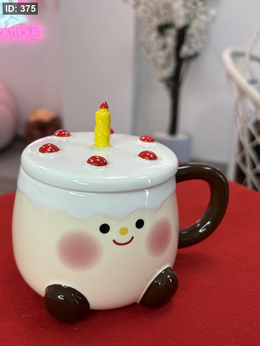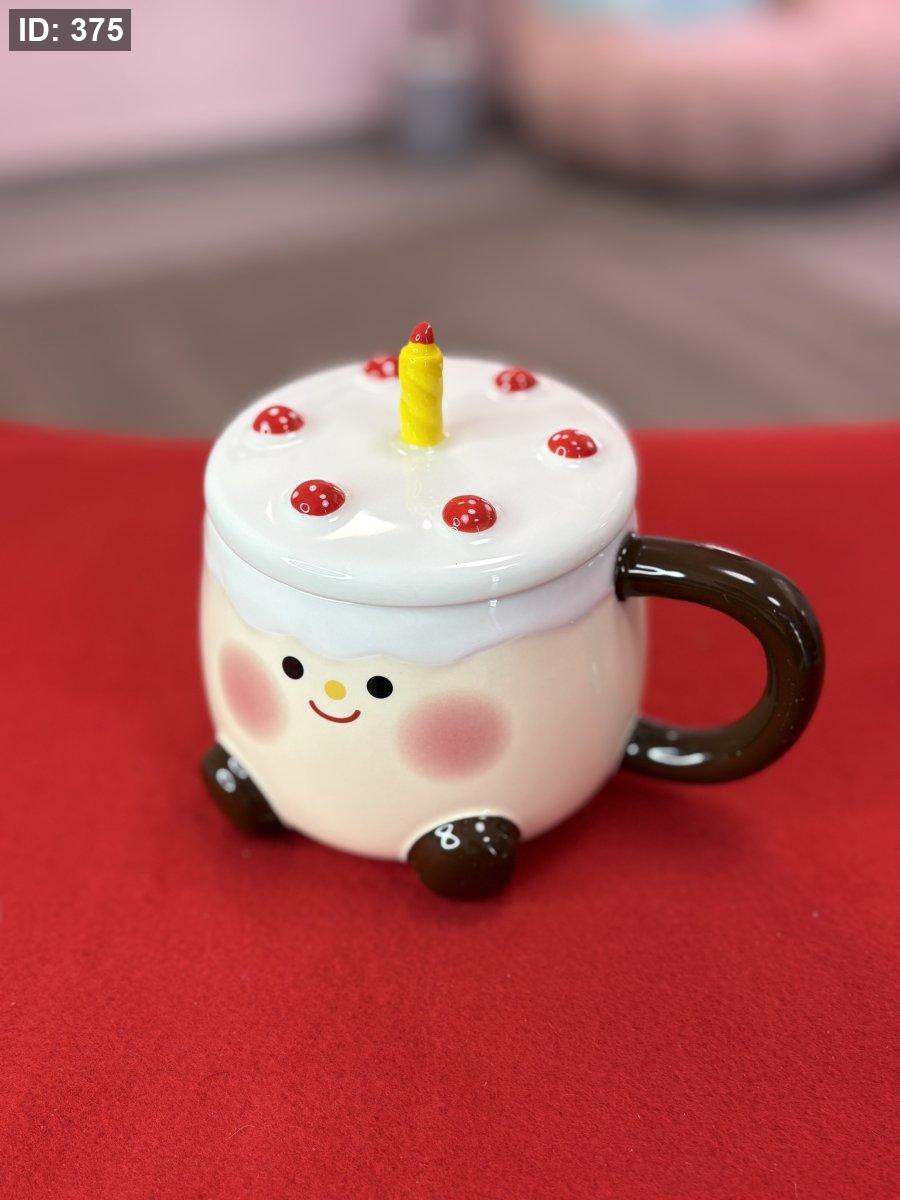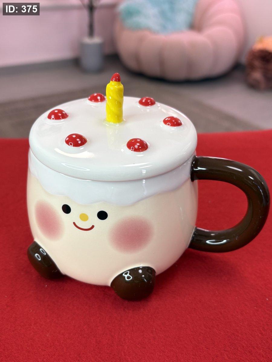 يشبه كعكة عيد ميلاد صغيرة، بلون بيج فاتح، ويزينه غطاء أبيض يشبه "الكريمة" مع نقاط حمراء تشبه الفراولة أو التوت، وشمعة صفراء صغيرة في المنتصف