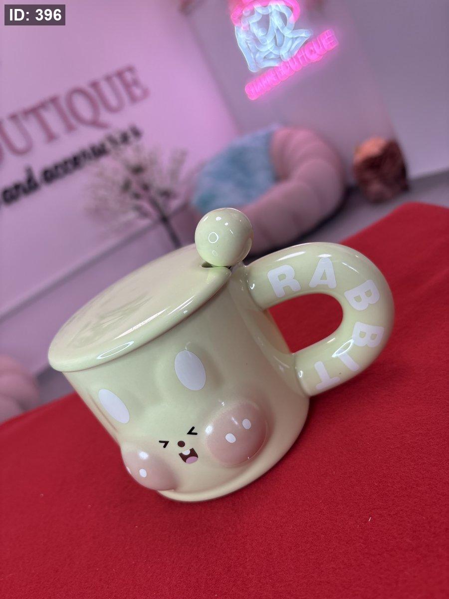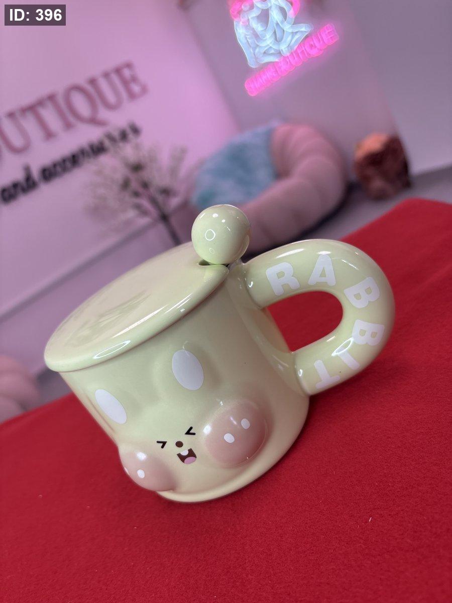 يتميز الكوب بتصميم أرنب كرتوني بارز ولطيف، مع خدود وردية وحروف "RABBIT" على المقبض