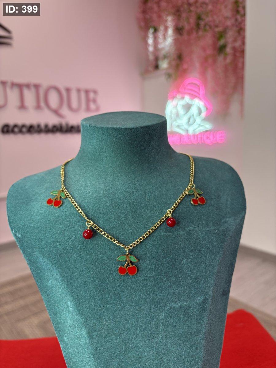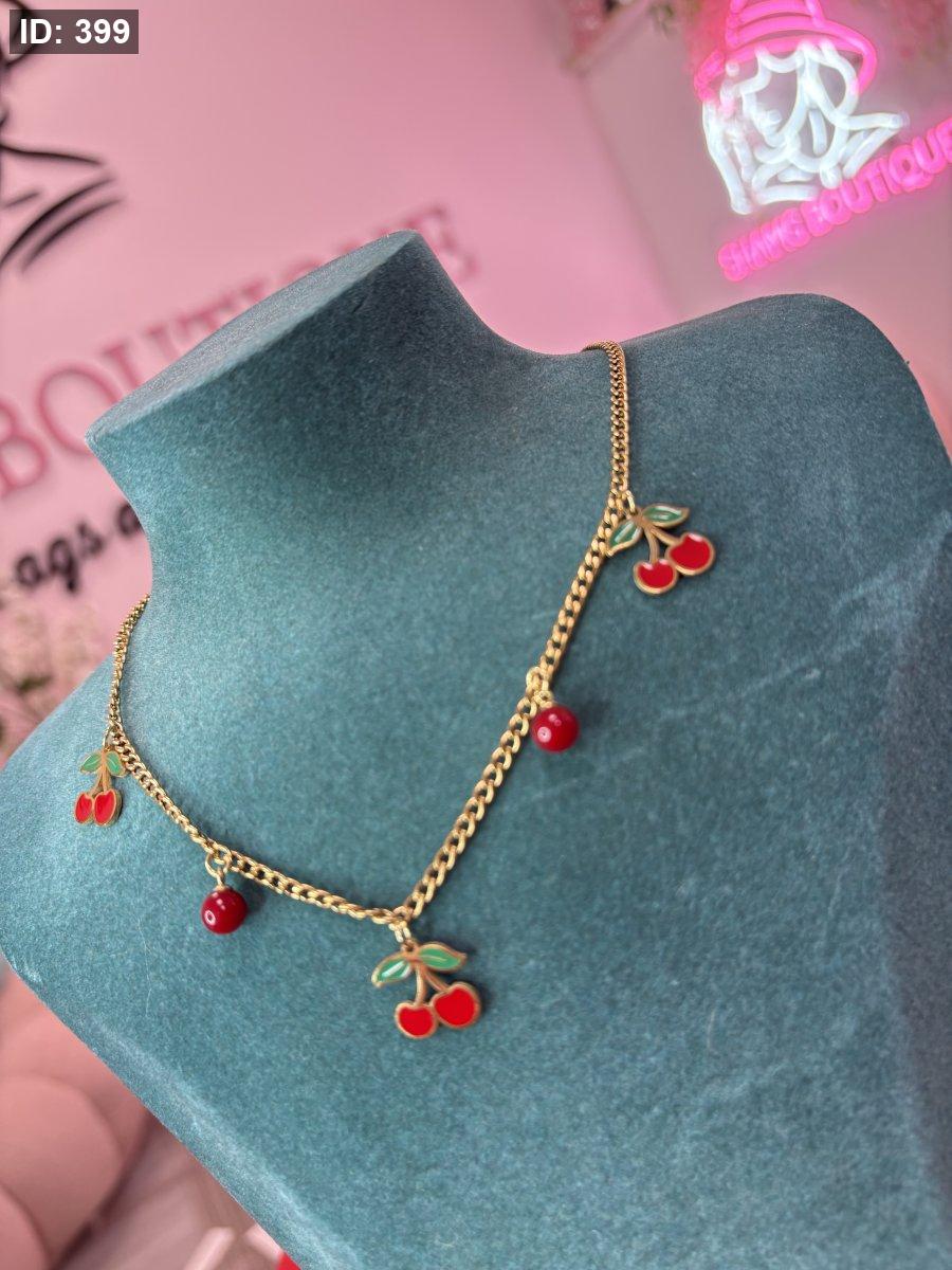 هذه قلادة نسائية من الفولاذ المقاوم للصدأ بتصميم أنيق مع حلية كرز حمراء من المينا.